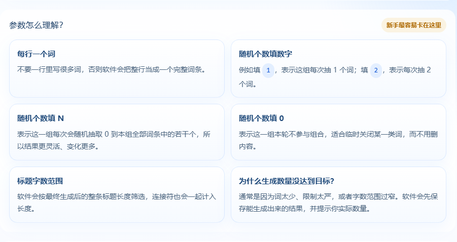 1、灵活参数配置:可自定义 M 个关键词,随机组合成 N 条内容,数量完全可控
