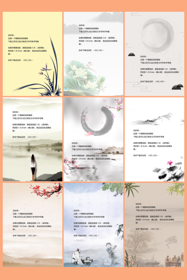 国风水墨信纸模板90套 电子版,无水印,可打印,免费分享 请看预览图 声明:本站部分文章、信息、图片、软件等来源于互联网,由本网整理发表,希望传递更多信息和学习之目的。如设计、版权等问题,请立即联系管理员,我们会给予更改或删除相关文章,保证您的权利。