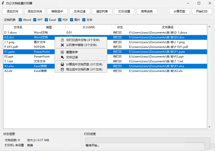 软件提供自定义文件筛选功能,可以根据文件类型快速过滤所需文档,支持灵活的打印设置(如双面打印、彩色/黑白模式、纸张大小等),并具备页数统计和打印进度监控功能。