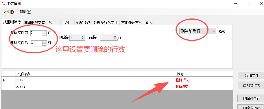 【txt删除前后行】功能介绍:这是txt神器其中一个功能,一键导入txt文档,批量删除开头和末尾的行数,几行都可以自定义。