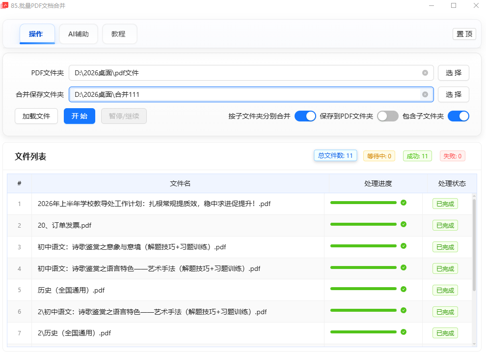 PDF合并软件:把多个 PDF 合成 1 个,或按子文件夹分别合并。